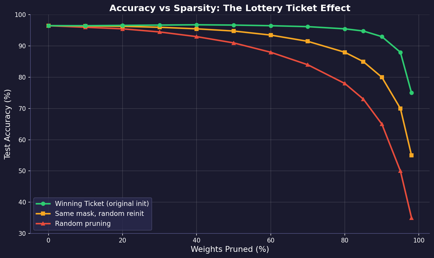 The chart above illustrates this effect. The winning ticket (green) maintains high accuracy even at extreme sparsity levels (80-90% of weights removed). The same pruning mask with a random reinitialization (orange) degrades earlier, and random pruning (red) collapses quickly. This confirms the hypothesis: it is the combination of structure (mask) and initialization that makes a winning ticket.